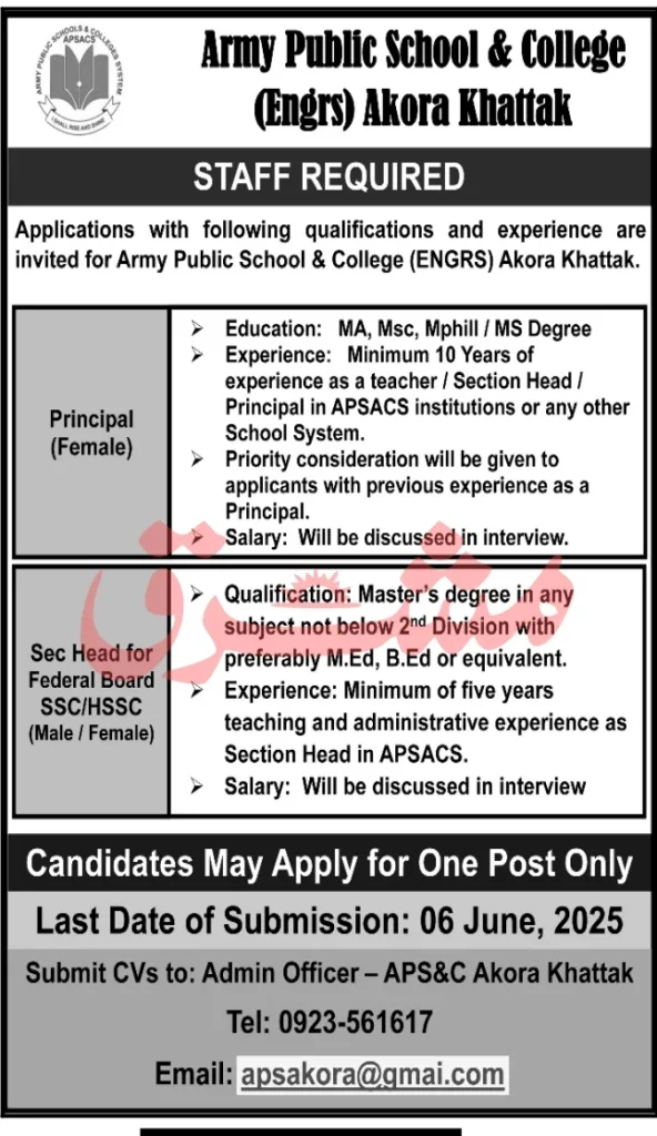 If you’re a motivated educator with strong leadership abilities, don’t miss this opportunity at Army Public School & College (Engrs), Akora Khattak. Apply before 06 June 2025 and take the next step in your academic career.