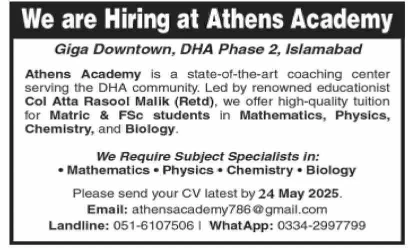 Athens Academy, a prestigious coaching center located in Giga Downtown, DHA Phase 2, Islamabad, is inviting applications from experienced educators. With a strong academic vision led by Col Atta Rasool Malik (Retd), the academy offers top-tier tuition for Matric and FSc students in science subjects.