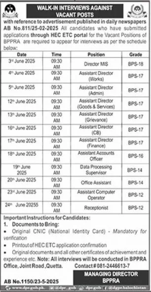 - Appear for Walk-In Interviews: Bring all documents to BPPRA Office, Joint Road, Quetta.