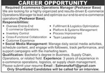 E-commerce Operations Manager Job in Peshawar 2025