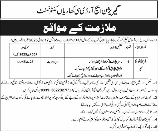 If you have a degree in Balochi language and a passion for teaching, don’t miss this chance to work at Garrison HRDC Kharian. Submit your application by 17 July 2025 and appear for the walk-in interview on 30 July 2025.