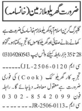 If you have experience in household cleaning or cooking and want a full-time job in Islamabad, this is a great chance to apply for positions in Gulberg Greens. Ensure you contact the provided numbers as soon as possible to secure your place.