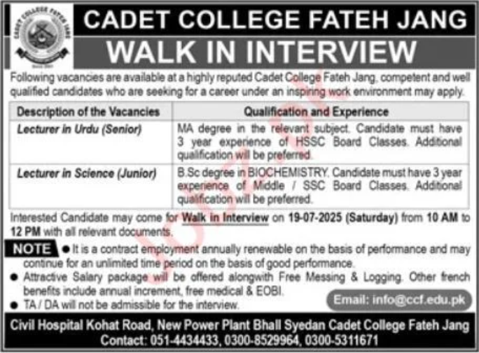 If you’re a passionate teacher looking for lecturer jobs in Punjab 2025, don’t miss this walk-in interview opportunity at Cadet College Fateh Jang. Bring your documents and appear on 19 July 2025 to be considered for a prestigious role in one of the leading government educational institutions in Pakistan.
