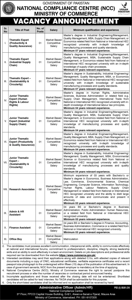 The Ministry of Commerce, Government of Pakistan, invites applications for various key positions at the National Compliance Centre (NCC) in Islamabad. This is a great opportunity for qualified professionals seeking full-time government jobs in management and administrative fields.