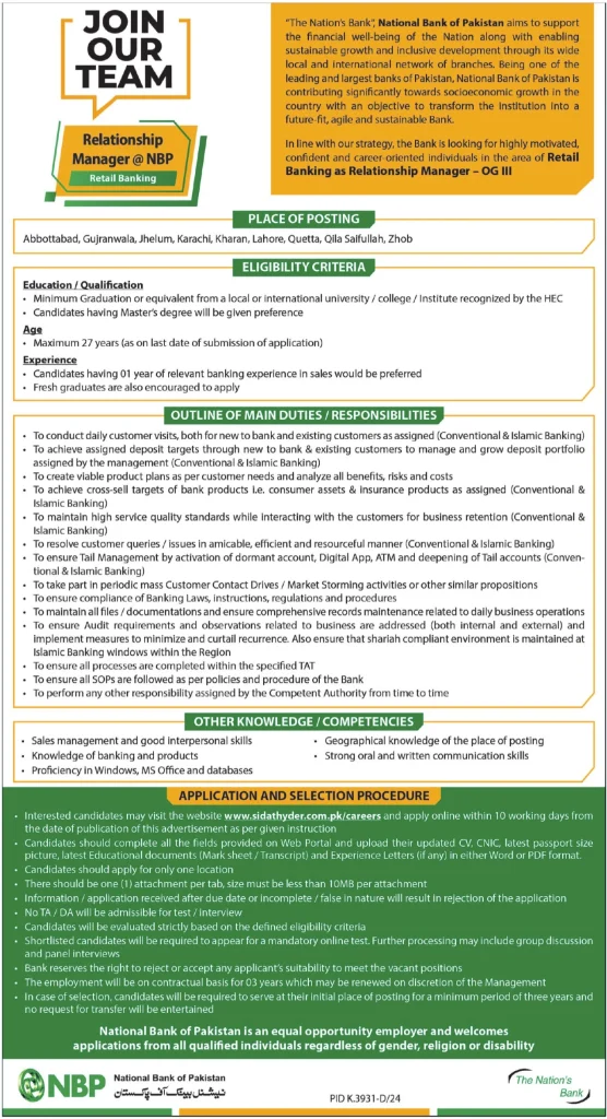The National Bank of Pakistan (NBP) has announced new vacancies for Relationship Manager (OG-III) under its Retail Banking division. This role is ideal for motivated, customer-focused individuals who are ready to contribute to one of Pakistan’s leading financial institutions. Latest Jobs in Lahore