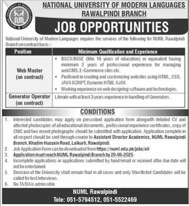 NUML Rawalpindi offers a valuable opportunity for skilled professionals to join a reputed academic institution on a contract basis. Whether you’re a tech-savvy web developer or an experienced generator operator, this is your chance to become part of a dynamic and professional environment.
