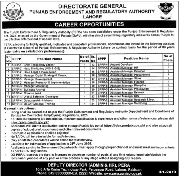 The Punjab Enforcement and Regulatory Authority (PERA), recently established under the Punjab Enforcement & Regulation Act 2024, has announced multiple career opportunities for highly qualified and skilled professionals. Based in Lahore, PERA is offering over 24 contract-based positions in various domains including IT, legal, HR, management, development, and monitoring. If you are looking for a government job in Punjab with career growth, this is your chance to apply through the official Punjab Jobs Portal before 25 June 2025. Latest Jobs in Lahore