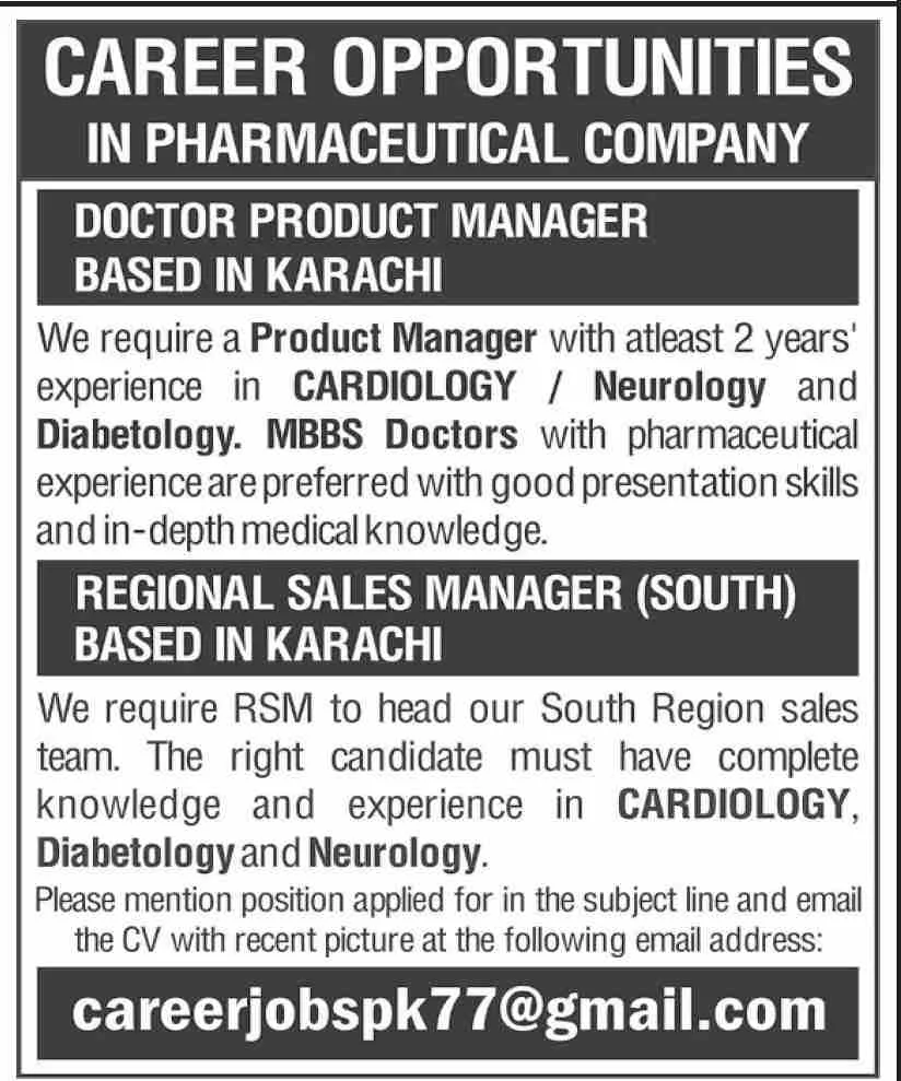 Doctor Product ManagerKarachiAt least 2 years in Cardiology, Neurology, DiabetologyMBBS with pharmaceutical experience preferredStrong medical knowledge, presentation skills