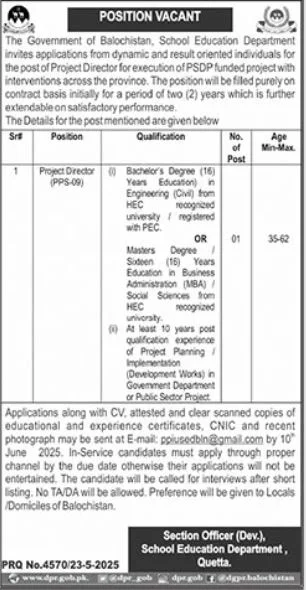 The Government of Balochistan’s School Education Department is offering an exciting opportunity for experienced professionals to join as a Project Director. This key position is part of a PSDP-funded initiative aimed at enhancing educational interventions across the province. If you have a strong background in project management and are passionate about driving positive change in the public sector, this contract-based role—initially for two years—offers a meaningful career path in one of Pakistan’s most vital sectors. Latest jobs in Quetta