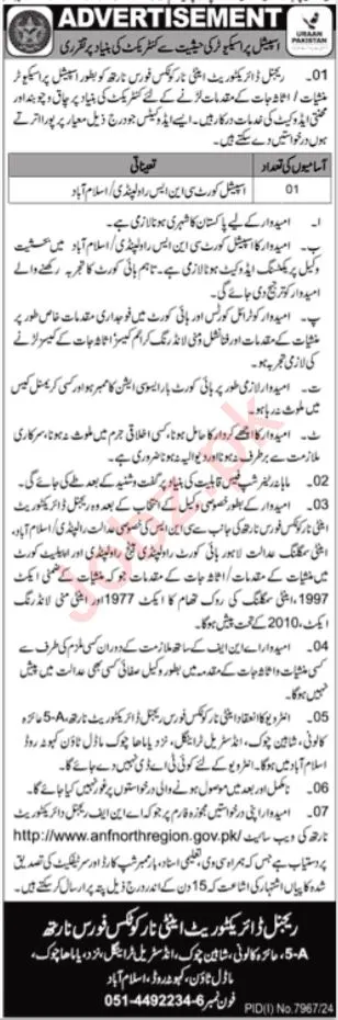 Regional Directorate North, ANF, 5-A Gulshan-e-Jinnah, G-5/1, Islamabad - Online applications can also be submitted at: