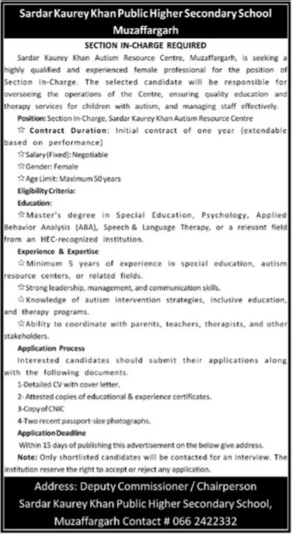 Sardar Kaurey Khan Autism Resource Centre, Muzaffargarh, is looking for a highly qualified and experienced female professional for the position of Section In-Charge. The role involves managing operations, quality education, and therapy services for children with autism. Latest job in UET Lahore.
